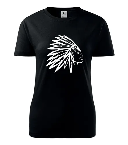 Černé dámské tričko indián. Nabízené velikosti jsou XS, S, M, L, XL, XXL. Výběr z 9 barev. Tričko patří do kategorií . Technologie potisku: Tisk na tričko je realizován pomocí termolisu a potisk je velice trvanlivý.