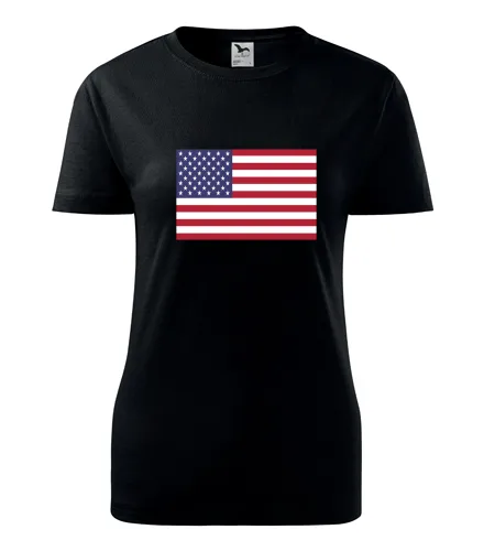 Černé dámské tričko s americkou vlajkou. Nabízené velikosti jsou XS, S, M, L, XL, XXL. Výběr z 9 barev. Tričko patří do kategorií Trička s vlajkou dámská. Technologie potisku: Tisk na tričko je realizován pomocí přímého digitální tisku na textil.