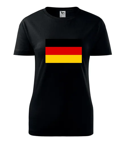 Černé dámské tričko s německou vlajkou. Nabízené velikosti jsou XS, S, M, L, XL, XXL. Výběr z 9 barev. Tričko patří do kategorií Trička s vlajkou dámská. Technologie potisku: Tisk na tričko je realizován pomocí přímého digitální tisku na textil.
