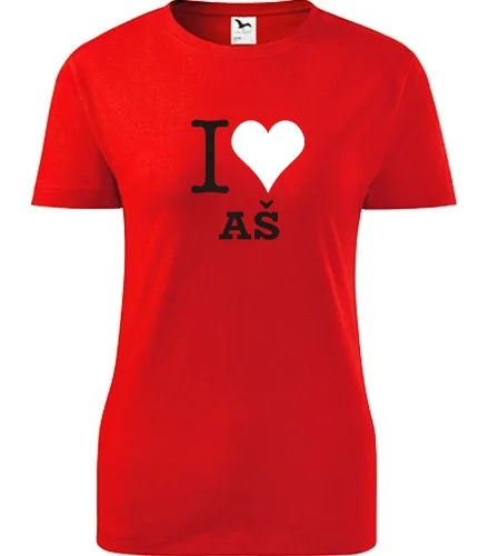 Tričko srdce. Červené dámské tričko I love Aš. Nabízené velikosti jsou XS, S, M, L, XL, XXL. Výběr z 9 barev. Tričko patří do kategorií . Technologie potisku: Tisk na tričko je realizován pomocí termolisu a potisk je velice trvanlivý.