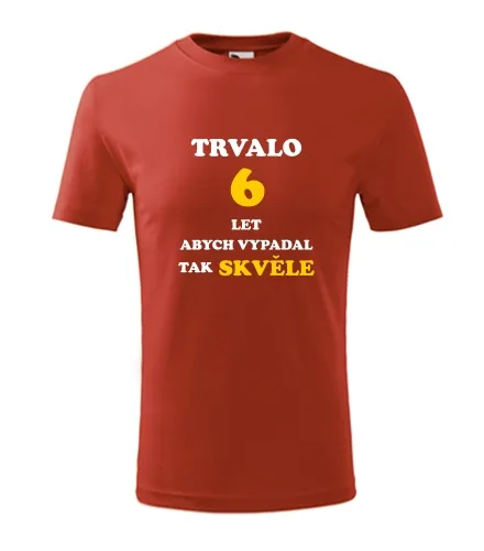 Dárek k 6. narozeninám pro kluka. Červené dětské tričko trvalo 6 let. Nabízené velikosti jsou 4 roky, 6 let, 8 let, 10 let, 12 let. Výběr z 13ti barev. Tričko patří do kategorií . Technologie potisku: Tisk na tričko je realizován pomocí termolisu a potisk je velice trvanlivý.