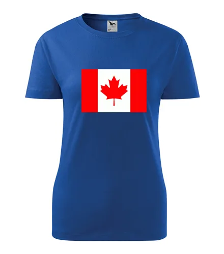 Modré dámské tričko s kanadskou vlajkou. Nabízené velikosti jsou XS, S, M, L, XL, XXL. Výběr z 9 barev. Tričko patří do kategorií Trička s vlajkou dámská. Technologie potisku: Tisk na tričko je realizován pomocí přímého digitální tisku na textil.