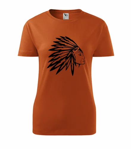 Oranžové dámské tričko indián. Nabízené velikosti jsou XS, S, M, L, XL, XXL. Výběr z 9 barev. Tričko patří do kategorií . Technologie potisku: Tisk na tričko je realizován pomocí termolisu a potisk je velice trvanlivý.