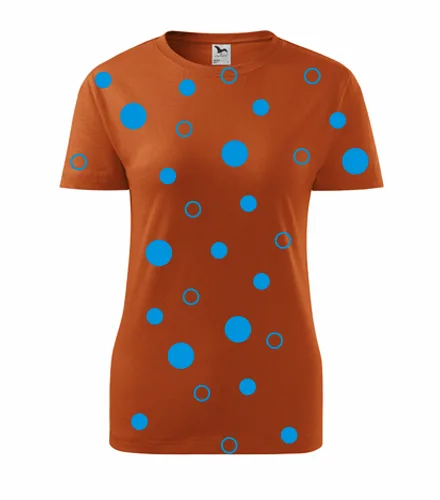 Oranžové dámské tričko s modrými kuličkami. Nabízené velikosti jsou XS, S, M, L, XL, XXL. Výběr z 9 barev. Tričko patří do kategorií Trička s puntíky. Technologie potisku: Tisk na tričko je realizován pomocí termolisu a potisk je velice trvanlivý.