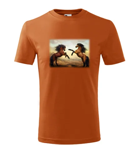 Oranžové dětské tričko s koňmi . Nabízené velikosti jsou 4 roky, 6 let, 8 let, 10 let, 12 let. Výběr z 13ti barev. Tričko patří do kategorií Trička se zvířaty dětská, Dětská trička s koňmi. Technologie potisku: Tisk na tričko je realizován pomocí přímého digitální tisku na textil.