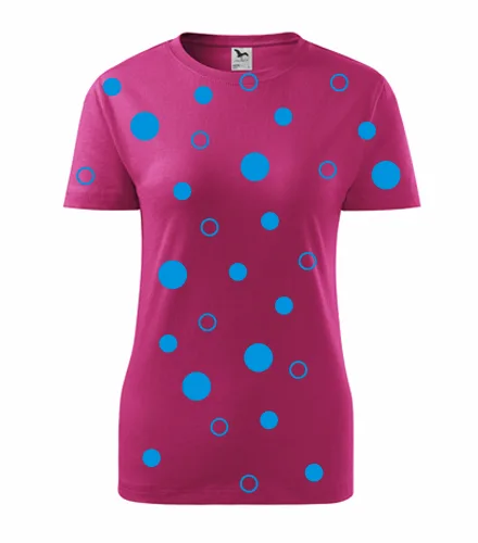 Purpurové dámské tričko s modrými kuličkami. Nabízené velikosti jsou XS, S, M, L, XL, XXL. Výběr z 9 barev. Tričko patří do kategorií Trička s puntíky. Technologie potisku: Tisk na tričko je realizován pomocí termolisu a potisk je velice trvanlivý.