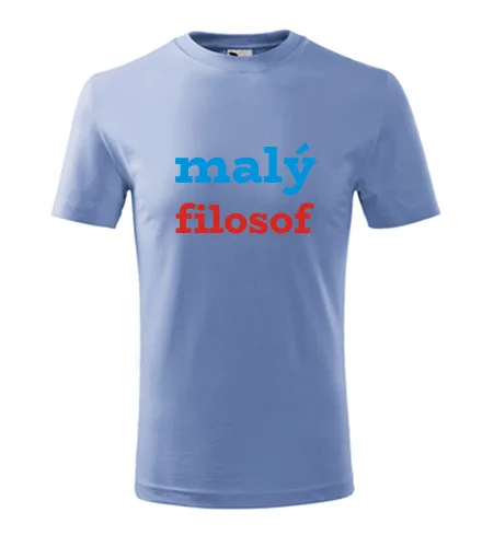 Světle modré dětské tričko malý filosof. Nabízené velikosti jsou 4 roky, 6 let, 8 let, 10 let, 12 let. Výběr z 13ti barev. Tričko patří do kategorií Vtipná dětská trička. Technologie potisku: Tisk na tričko je realizován pomocí termolisu a potisk je velice trvanlivý.