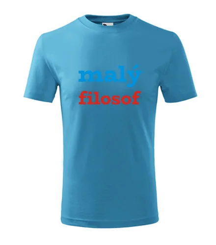 Tyrkysové dětské tričko malý filosof. Nabízené velikosti jsou 4 roky, 6 let, 8 let, 10 let, 12 let. Výběr z 13ti barev. Tričko patří do kategorií Vtipná dětská trička. Technologie potisku: Tisk na tričko je realizován pomocí termolisu a potisk je velice trvanlivý.