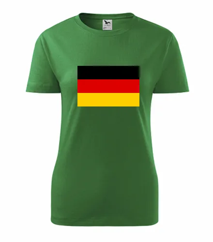Zelené dámské tričko s německou vlajkou. Nabízené velikosti jsou XS, S, M, L, XL, XXL. Výběr z 9 barev. Tričko patří do kategorií Trička s vlajkou dámská. Technologie potisku: Tisk na tričko je realizován pomocí přímého digitální tisku na textil.