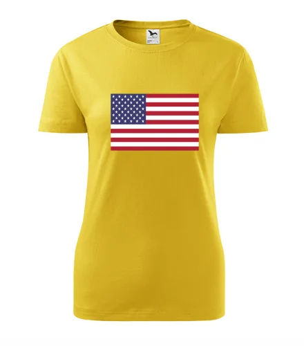 Žluté dámské tričko s americkou vlajkou. Nabízené velikosti jsou XS, S, M, L, XL, XXL. Výběr z 9 barev. Tričko patří do kategorií Trička s vlajkou dámská. Technologie potisku: Tisk na tričko je realizován pomocí přímého digitální tisku na textil.