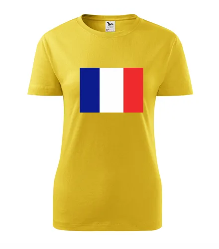 Žluté dámské tričko s francouzskou vlajkou. Nabízené velikosti jsou XS, S, M, L, XL, XXL. Výběr z 9 barev. Tričko patří do kategorií Trička s vlajkou dámská. Technologie potisku: Tisk na tričko je realizován pomocí přímého digitální tisku na textil.
