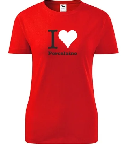 Dárek pro pejskařku. Červené dámské tričko I love Porcelaine. Nabízené velikosti jsou S,M,L,XL,XXL. Tričko patří do kategorií Dárek pro pejskařku, Dárek pro chovatelku psů. Technologie potisku: Tisk na tričko je realizován pomocí termolisu a potisk je velice trvanlivý.