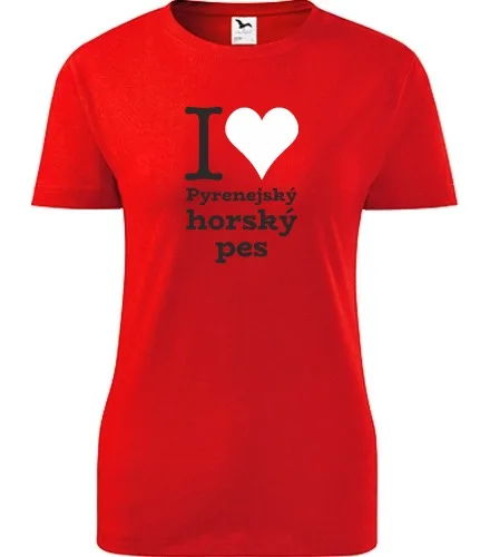 Dárek pro pejskařku. Červené dámské tričko I love Pyrenejský horský pes. Nabízené velikosti jsou S,M,L,XL,XXL. Tričko patří do kategorií Dárek pro pejskařku, Dárek pro chovatelku psů. Technologie potisku: Tisk na tričko je realizován pomocí termolisu a potisk je velice trvanlivý.