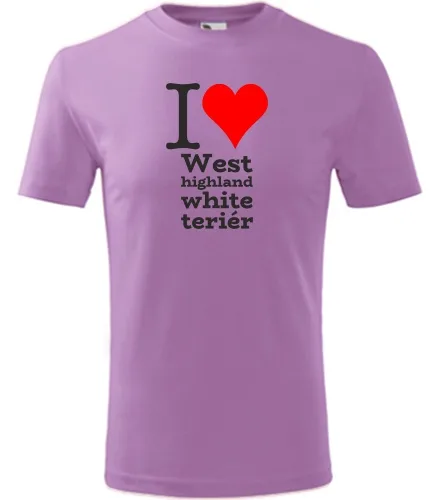 Dárek pro malého pejskaře / pejskařku. Fialové dětské tričko I love West highland white teriér. Nabízené velikosti jsou 4roky,6let,8let,10let,12let. Tričko patří do kategorií Dárek pro malého pejskaře / pejskařku. Technologie potisku: Tisk na tričko je realizován pomocí termolisu a potisk je velice trvanlivý.