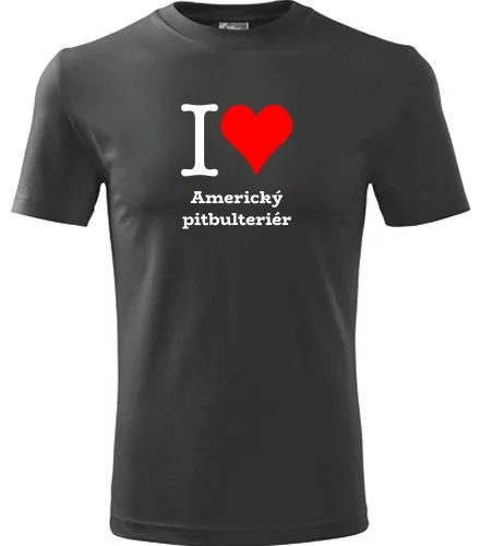 Dárek pro pejskaře. Grafitové tričko I love Americký pitbulteriér. Nabízené velikosti jsou S, M, L, XL, XXL, XXXL. Tričko patří do kategorií Dárek pro pejskaře. Technologie potisku: Tisk na tričko je realizován pomocí termolisu a potisk je velice trvanlivý.