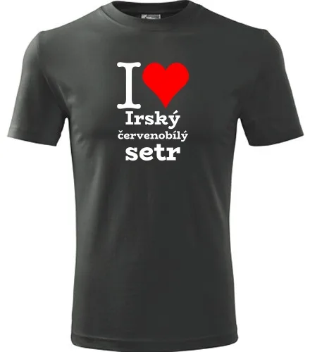 Dárek pro pejskaře. Grafitové tričko I love Irský červenobílý setr. Nabízené velikosti jsou S, M, L, XL, XXL, XXXL. Tričko patří do kategorií Dárek pro pejskaře. Technologie potisku: Tisk na tričko je realizován pomocí termolisu a potisk je velice trvanlivý.