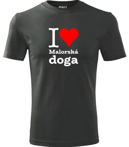 Dárek pro pejskaře. Grafitové tričko I love Malorská doga. Nabízené velikosti jsou S, M, L, XL, XXL, XXXL. Tričko patří do kategorií Dárek pro pejskaře. Technologie potisku: Tisk na tričko je realizován pomocí termolisu a potisk je velice trvanlivý.