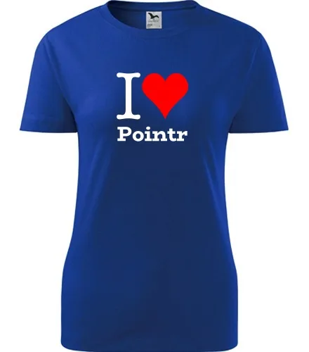 Dárek pro pejskařku. Modré dámské tričko I love Pointr. Nabízené velikosti jsou S,M,L,XL,XXL. Tričko patří do kategorií Dárek pro pejskařku, Dárek pro chovatelku psů. Technologie potisku: Tisk na tričko je realizován pomocí termolisu a potisk je velice trvanlivý.