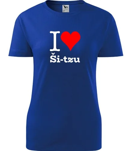 Dárek pro pejskařku. Modré dámské tričko I love Ši-tzu. Nabízené velikosti jsou S,M,L,XL,XXL. Tričko patří do kategorií Dárek pro pejskařku, Dárek pro chovatelku psů. Technologie potisku: Tisk na tričko je realizován pomocí termolisu a potisk je velice trvanlivý.