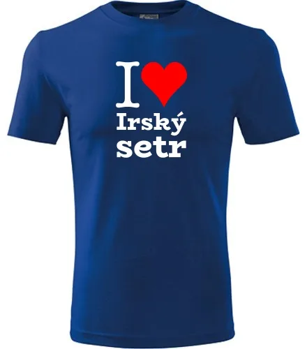 Dárek pro malého pejskaře / pejskařku. Modré dětské tričko I love Irský setr. Nabízené velikosti jsou 4roky,6let,8let,10let,12let. Tričko patří do kategorií Dárek pro malého pejskaře / pejskařku. Technologie potisku: Tisk na tričko je realizován pomocí termolisu a potisk je velice trvanlivý.