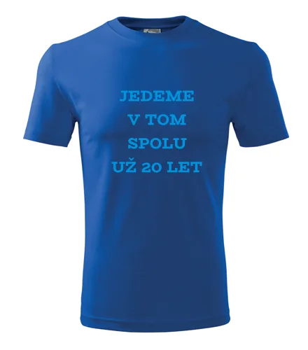 Modré tričko jedeme v tom spolu + počet let. Nabízené velikosti jsou S, M, L, XL, XXL, XXXL. Výběr z 12 barev. Tričko patří do kategorií Dárek k výročí svatby, Trička pro páry. Technologie potisku: Tisk na tričko je realizován pomocí termolisu a potisk je velice trvanlivý.