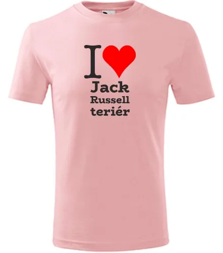 Dárek pro malého pejskaře / pejskařku. Růžové dětské tričko I love Jack Russell teriér. Nabízené velikosti jsou 4roky,6let,8let,10let,12let. Tričko patří do kategorií Dárek pro malého pejskaře / pejskařku. Technologie potisku: Tisk na tričko je realizován pomocí termolisu a potisk je velice trvanlivý.