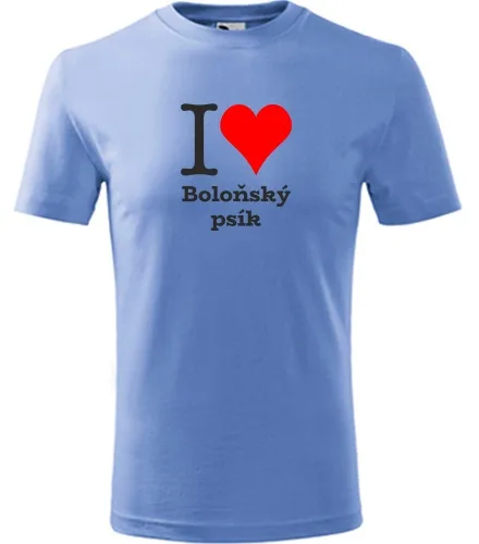 Dárek pro malého pejskaře / pejskařku. Světle modré dětské tričko I love Boloňský psík. Nabízené velikosti jsou 4roky,6let,8let,10let,12let. Tričko patří do kategorií Dárek pro malého pejskaře / pejskařku. Technologie potisku: Tisk na tričko je realizován pomocí termolisu a potisk je velice trvanlivý.