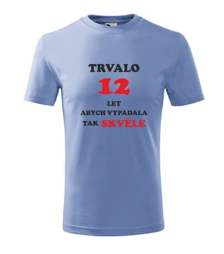 Dárky pro dvanáctiletou holku. Světle modré dětské tričko trvalo 12 let. Nabízené velikosti jsou 4 roky, 6 let, 8 let, 10 let, 12 let. Výběr z 13ti barev. Tričko patří do kategorií . Technologie potisku: Tisk na tričko je realizován pomocí termolisu a potisk je velice trvanlivý.