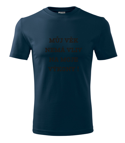 Tmavě modré tričko Můj věk nemá vliv na moje výkony. Tričko obsahuje černý text MŮJ VĚK NEMÁ VLIV NA MOJE VÝKONY! Potisk realizován pomocí transferového tisku a je trvanlivý.