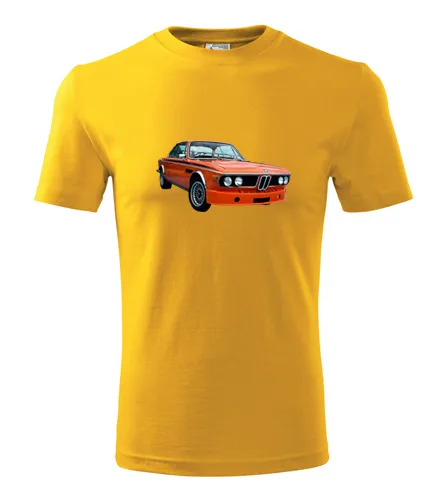 Žluté tričko s BMW 30 CSL. Nabízené velikosti jsou S, M, L, XL, XXL, XXXL. Výběr z 12 barev. Tričko patří do kategorií Dárek pro příznivce aut, BMW trička pánská. Technologie potisku: Tisk na tričko je realizován pomocí přímého digitální tisku na textil.